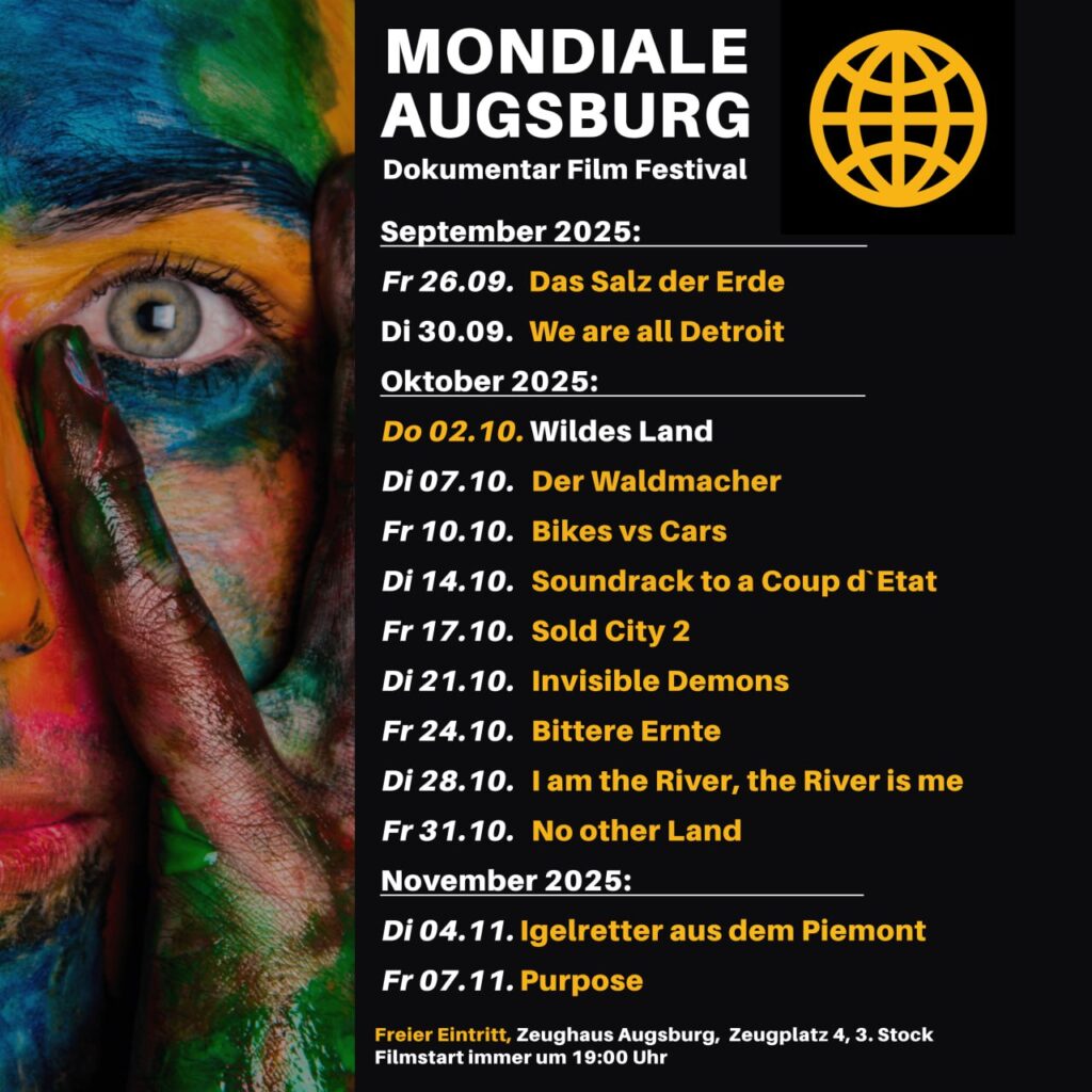 Vom 26. September bis zum 7. November 2025 gibt es in Augsburg wieder 13 hochkarätige Dokumentarfilme zu weltweit drängenden Themen auf der großen Kinoleinwand im Filmsaal des Zeughauses zu sehen. Der Eintritt zu allen Vorführungen ist frei. Filmstart ist jeweils um 19 Uhr. Alle Veranstaltungen finden im Filmsaal des Zeughauses, 3. Stock, statt.